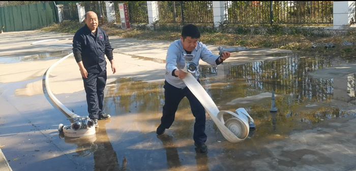 同時,華騰化工還專門組織了消火栓實操。“先接水帶、再開閥門、最后對準目標出水!”在安全員的指導下,員工兩人一組協(xié)作,快速完成水帶連接、水槍連接等步驟,水柱精準噴射至指定區(qū)域,整個過程有條不紊。