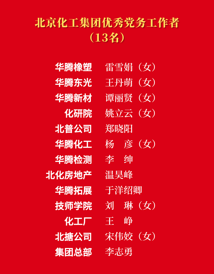 為熱烈慶祝中國共產(chǎn)黨成立103周年,大力表彰在推進(jìn)“十四五”規(guī)劃、推動集團(tuán)“231”戰(zhàn)略布局、完成重點(diǎn)工作任務(wù)等各方面涌現(xiàn)出來的先進(jìn)集體和先進(jìn)個(gè)人,市國資委黨委決定,授予北搪黨委“先進(jìn)基層黨組織”稱號,授予技師學(xué)院姜洪強(qiáng)“優(yōu)秀共產(chǎn)黨員”稱號,授予北京化工集團(tuán)總部李志勇“優(yōu)秀黨務(wù)工作者”稱號;北京化工集團(tuán)黨委決定,授予14個(gè)黨支部“先進(jìn)基層黨支部”稱號,授予29名同志“優(yōu)秀共產(chǎn)黨員”稱號,授予13名同志“優(yōu)秀黨務(wù)工作者”稱號。